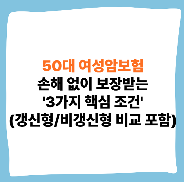 50대 여성 암보험 가입의 성공 여부는 초기 보험료의 저렴함이 아니라, **'100세까지 안정적인 보장을 유지하는 구조'**를 만드는 것에 달려있습니다. 오늘 제시된 **3가지 핵심 조건(5천만 원 진단금, 여성 특정 암 보장, 비갱신형 총액 비교)**을 기준으로 자신의 상황을 점검하세요. 이 기준을 통과한 보험이야말로 노후를 위한 가장 든든한 투자입니다. 다음 단계에서는 **암 진단 후 보장받는 '생활비(요양) 특약'**을 활용하여 진단금 외 추가 현금을 확보하는 방법을 알아보시는 것을 추천합니다.